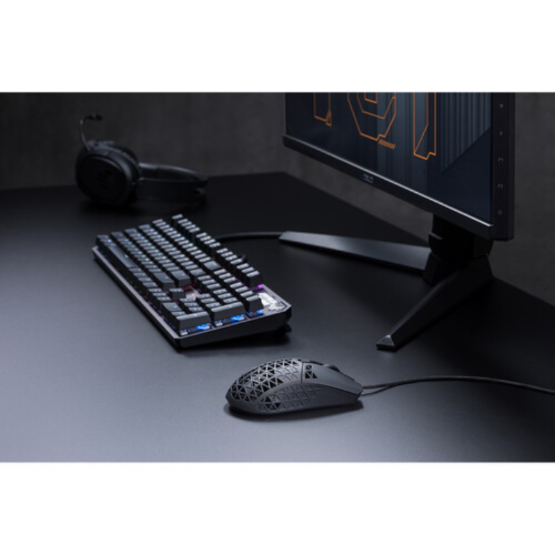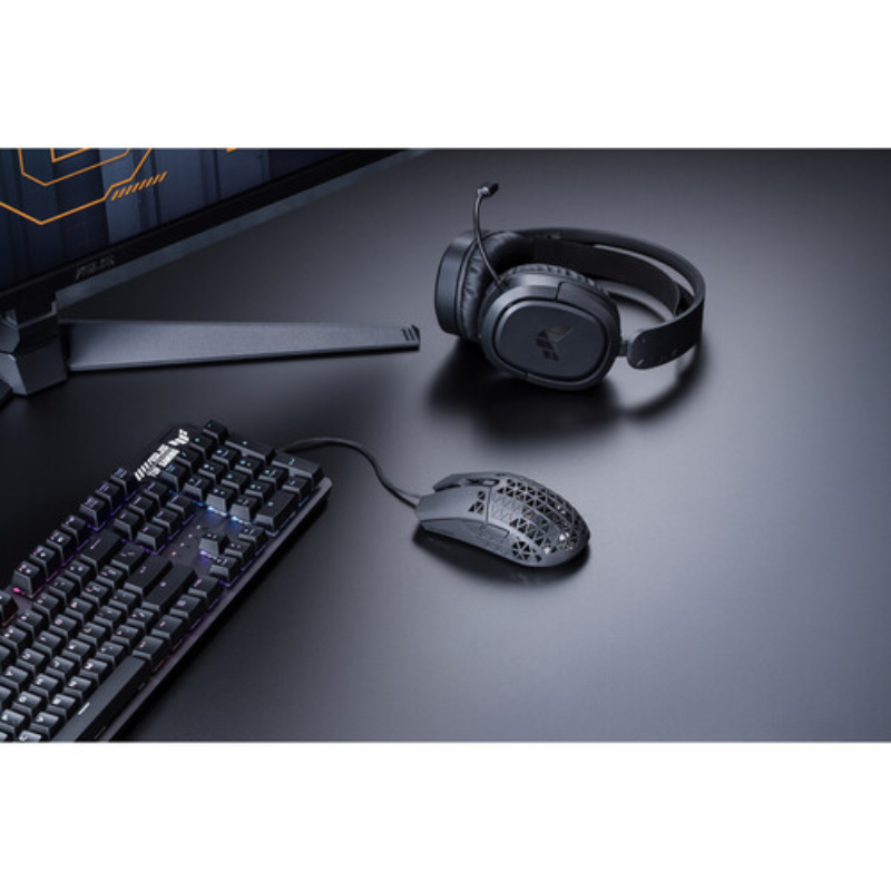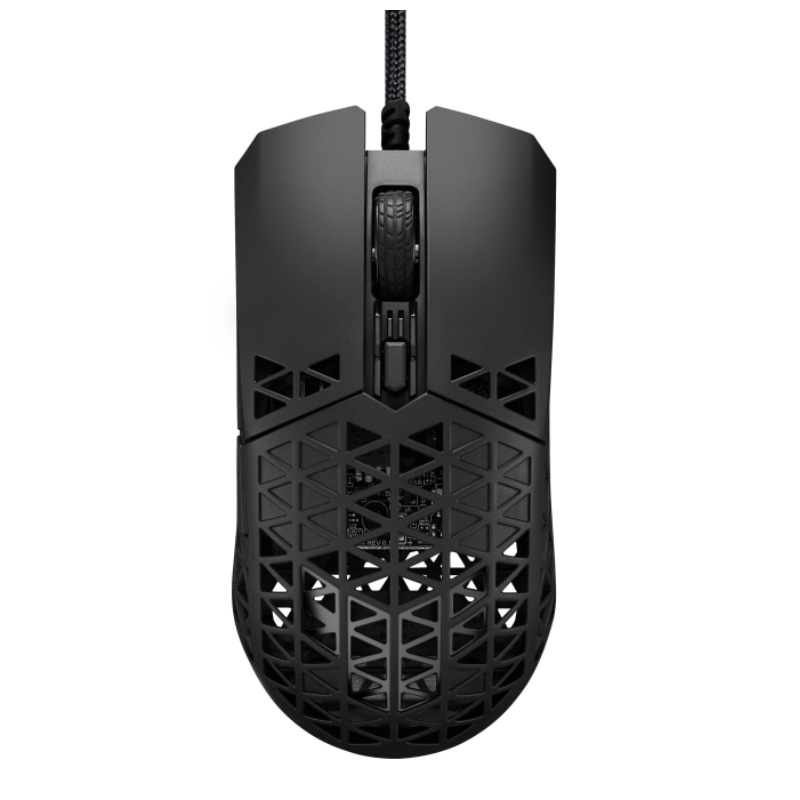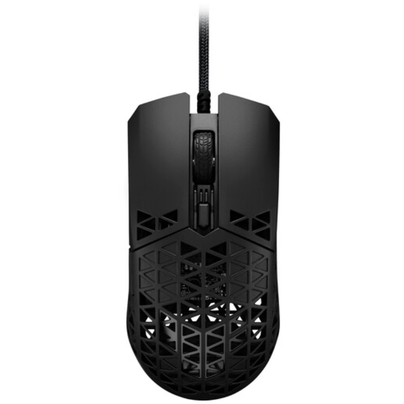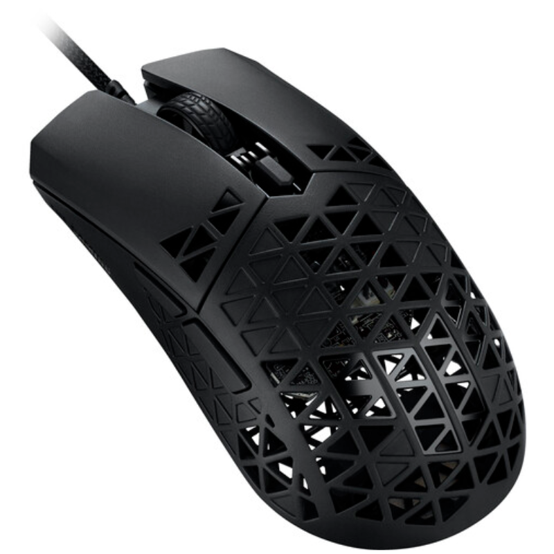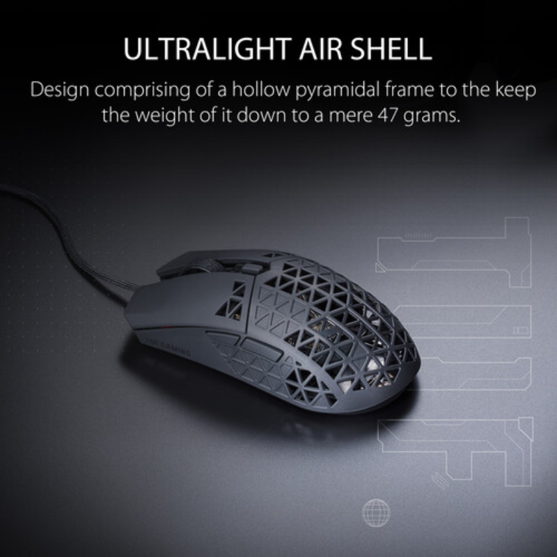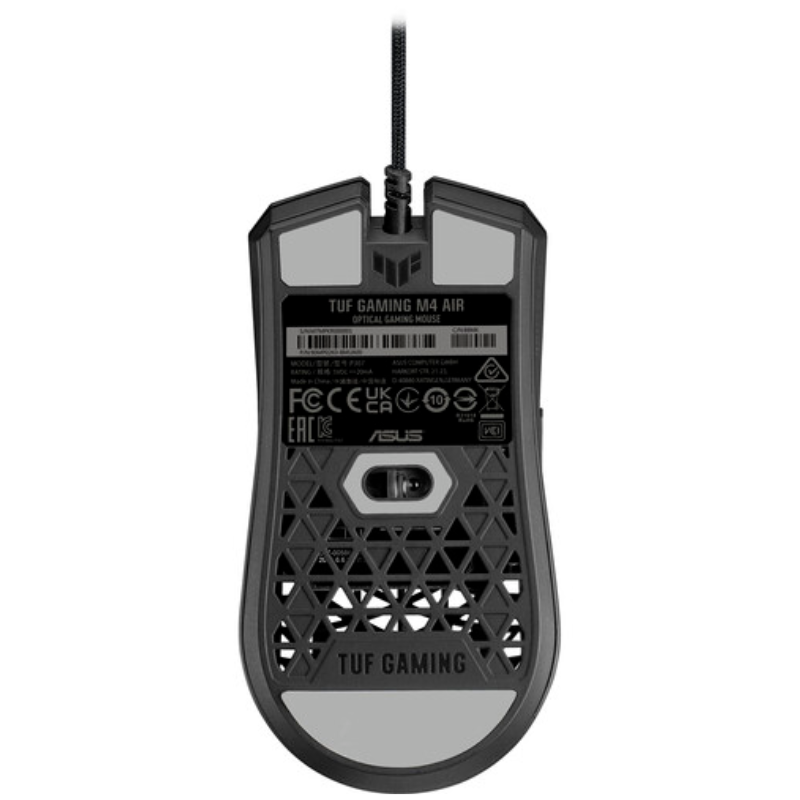 ASUS P307 TUF GAMING M4 Air is a lightweight wired gaming mouse with a 16,000 dpi sensor, six programmable buttons, an ultralight Air Shell, IPX6 water resistance, ASUS Antibacterial Guard, TUF Gaming Paracord, and pure PTFE feet- Black